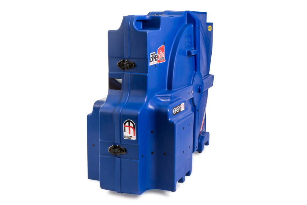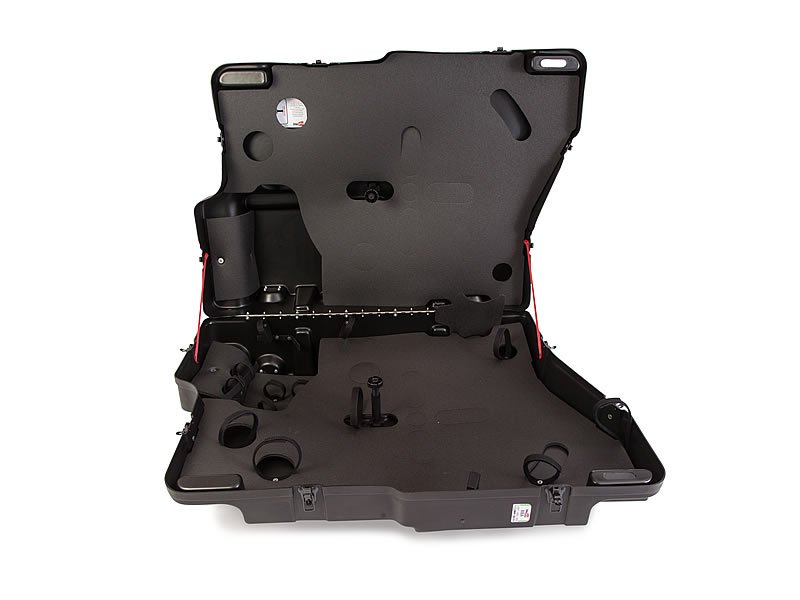 - Система фиксации и крепления. Колеса и рама фиксируются внутри при помощи широких ремней с мягкими липучками. Это исключает смещение техники внутри бокса при транспортировке, но при этом не создает точечного давления на карбон или алюминий.